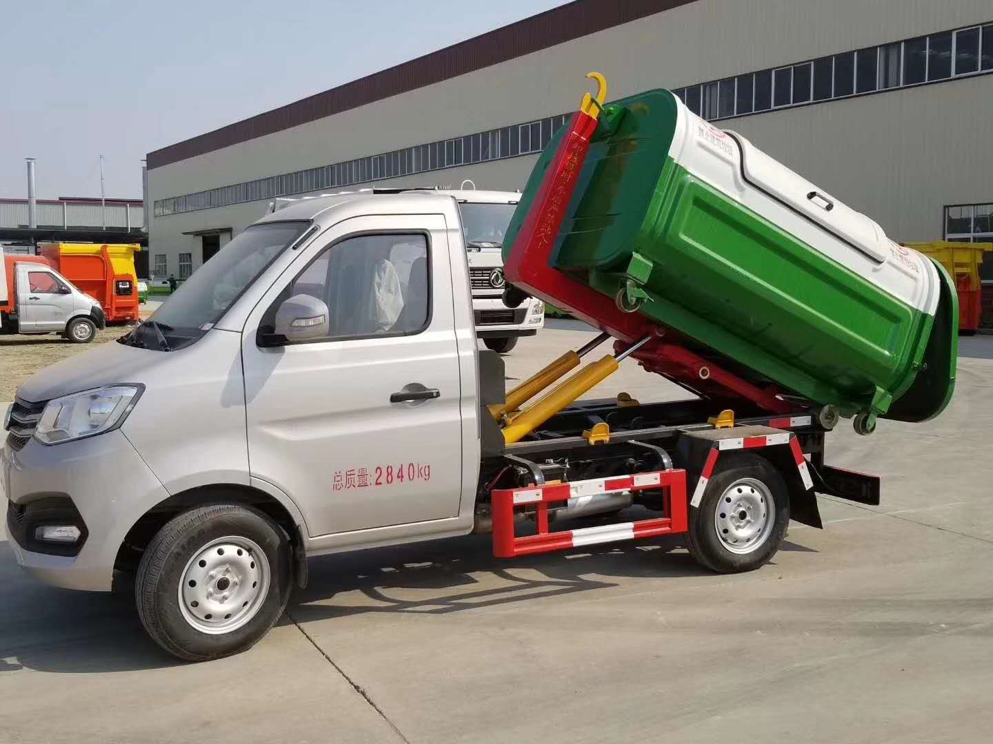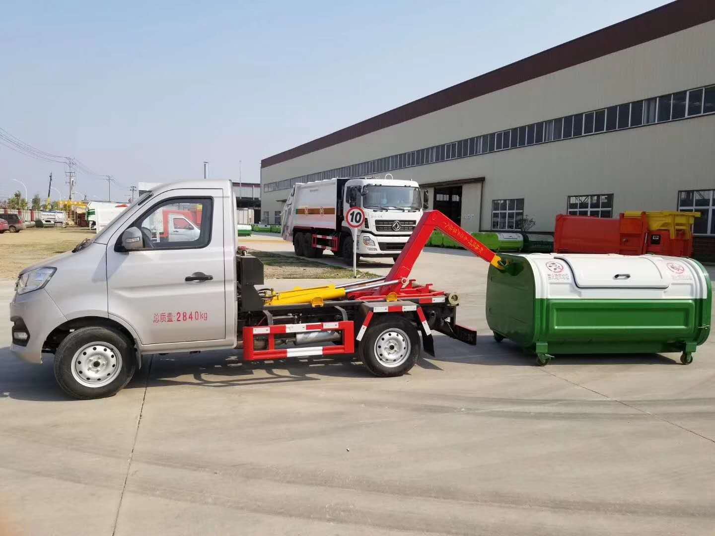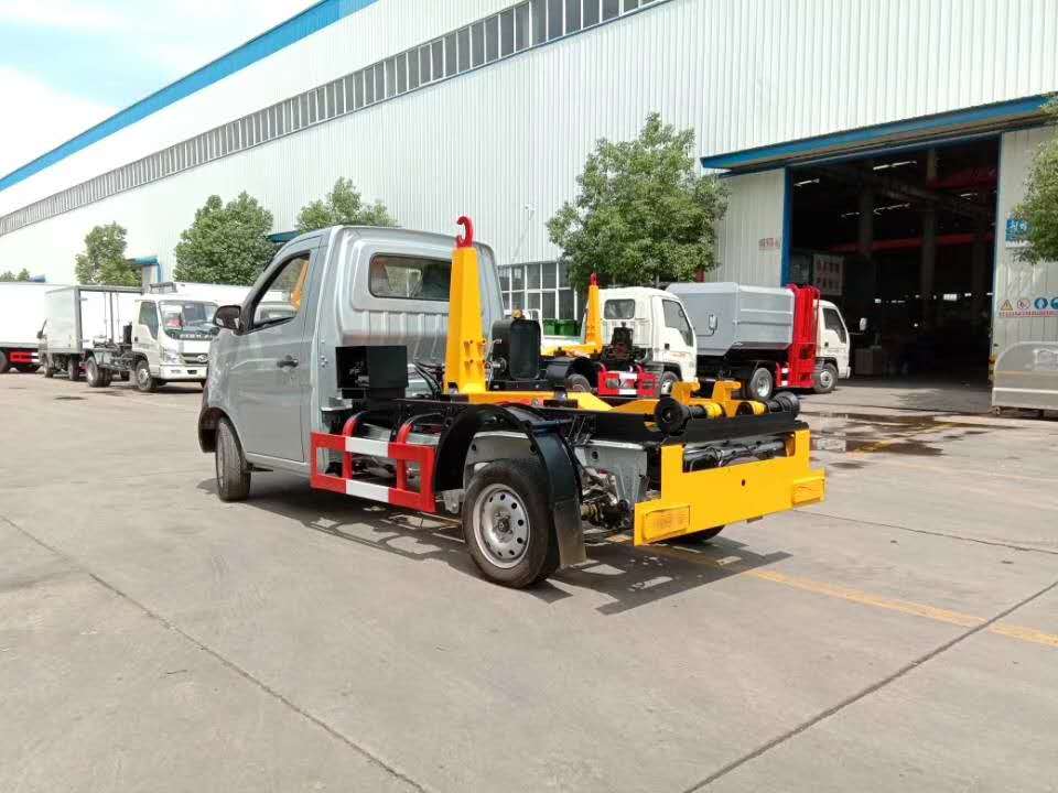 該車廣泛適用于城市街道學(xué)校垃圾處理,可一車配備多個斗,各個垃圾點放置多個,帶自卸功能,液壓操作,方便傾倒。在平日里可將車載垃圾箱放置到各個垃圾收集站,待垃圾收集滿后,該車可直接開赴至垃圾站,通過液壓系統(tǒng)的操控,可將垃圾車后座上加裝的勾臂放下,掛住站內(nèi)垃圾箱前端的連接點,將垃圾箱拉至車體的后座上,此時即可啟動車輛,將垃圾運送至垃圾處理站內(nèi),進(jìn)行自卸式傾倒。